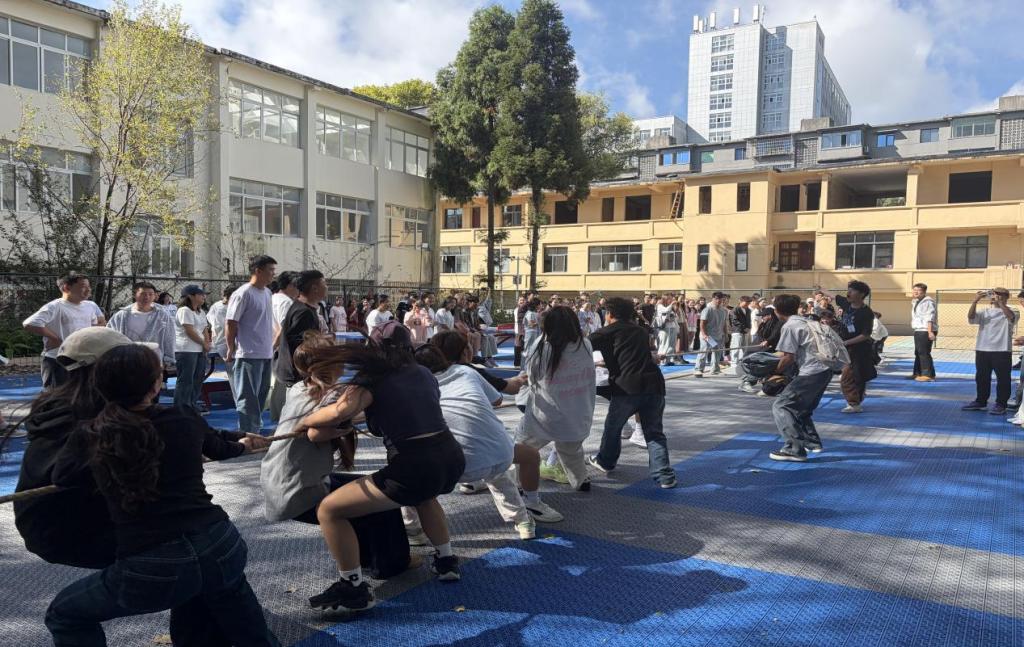 比赛现场气氛热烈,场上欢呼声、呐喊声此起彼伏。参赛队伍双手紧攥绳索,身体后倾,形成整齐划一的发力姿势,随着裁判哨声响起,用尽全力与对手展开较量。那专注的神情和拼搏的姿态展现了艺术学院学子的朝气与活力。