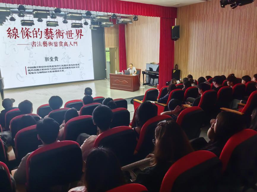 5月9日下午,艺术学院在美术楼一楼演播厅举办书法讲座,此次讲座邀请到安顺市文联副主席、市书法家协会主席郭堂贵先生作讲授,美术专业师生100余人聆听讲座。